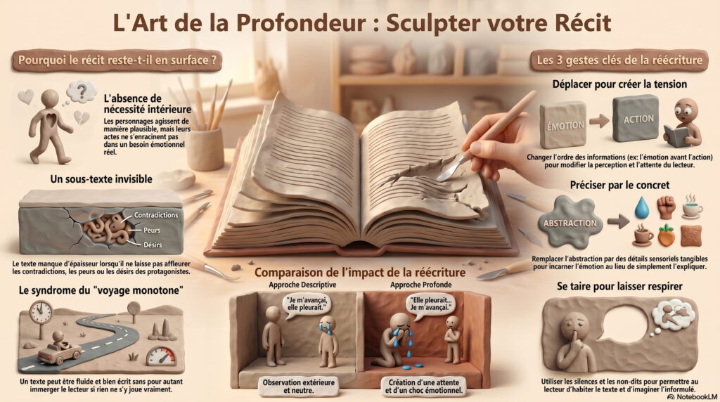 La réécriture va bien au-delà de la simple correction ou clarification ; elle sert à creuser le texte pour faire émerger l’implicite. C’est lors de cette étape que l’auteur sculpte, par petites touches, les failles, les hésitations et les motivations des personnages, afin de rendre perceptible ce qui n’était qu’en germe dans la première version.