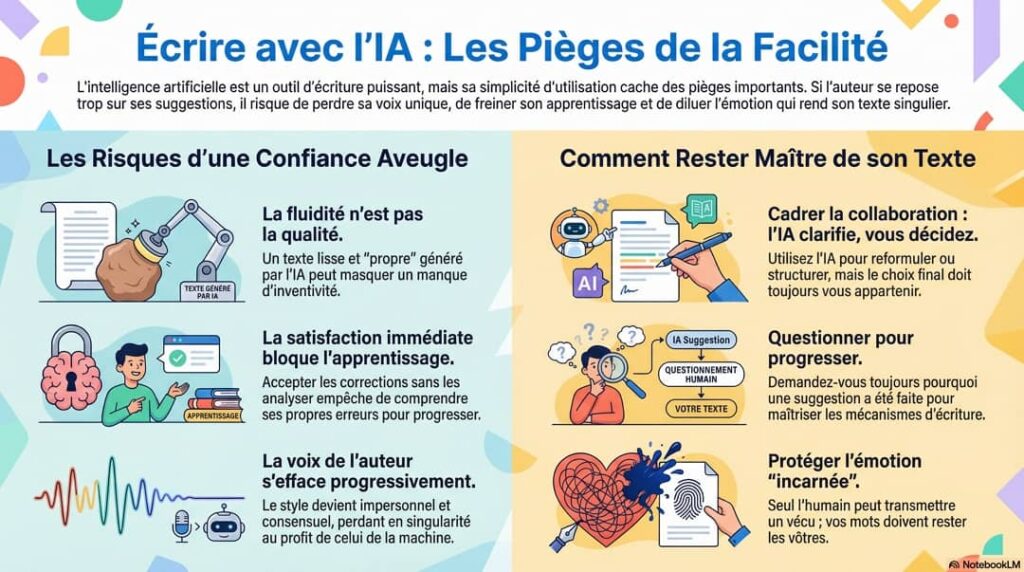 La fluidité est un confort de lecture, pas un critère de qualité littéraire ou intellectuelle. Lorsqu’elle n’est plus interrogée, elle endort l’esprit critique. Le texte semble abouti, mais l’auteur n’a pas progressé dans sa maîtrise ni dans sa pensée.